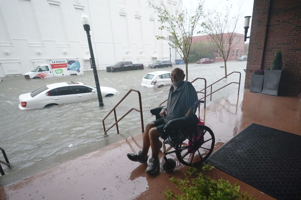 Muž na vozíku sleduje zaplavenú ulicu v dôsledku vyčíňania hurikánu Sally v centre mesta Pensacola na Floride v stredu 16. septembra 2020. Foto: TASR/AP