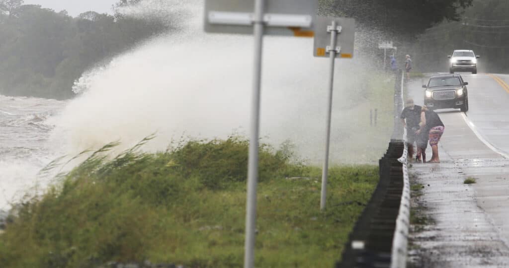 Vlny sa valia cez hrádzu na štátnu diaľnicu 20 neďaleko pláže Choctaw Beach na Floridepočas vyčíňania hurikánu Sally v stredu 16. septembra 2020. Foto: TASR/AP