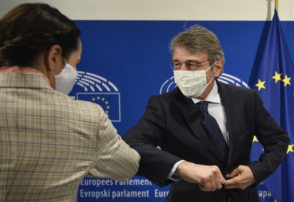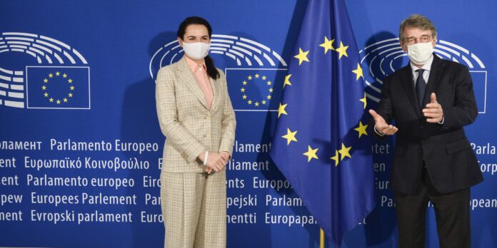 Predseda Európskeho parlamentu David Sassoli (vpravo) víta bieloruskú opozičnú líderku Sviatlanu Cichanovskú pred ich stretnutím v Európskom parlamente v Bruseli 21. septembra 2020. Foto: TASR/AP