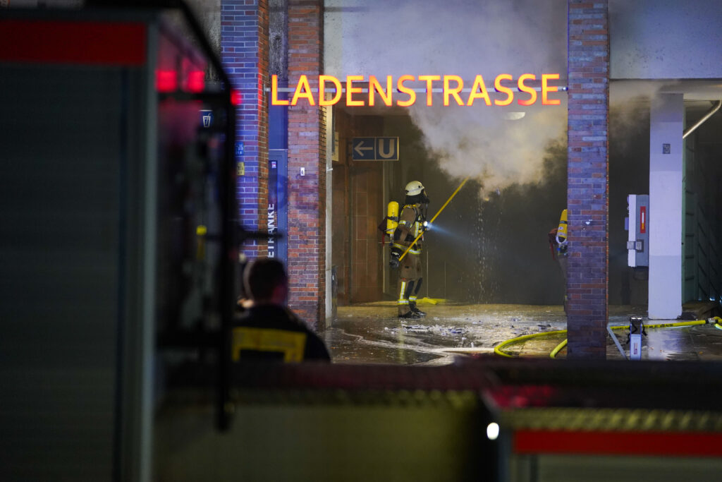 Hasič hasí požiar, ktorý vypukol v rade obchodov na stanici metra Uncle Tom’s Hut v Berlíne v nedeľu 15. novembra 2020. Foto: TASR/AP